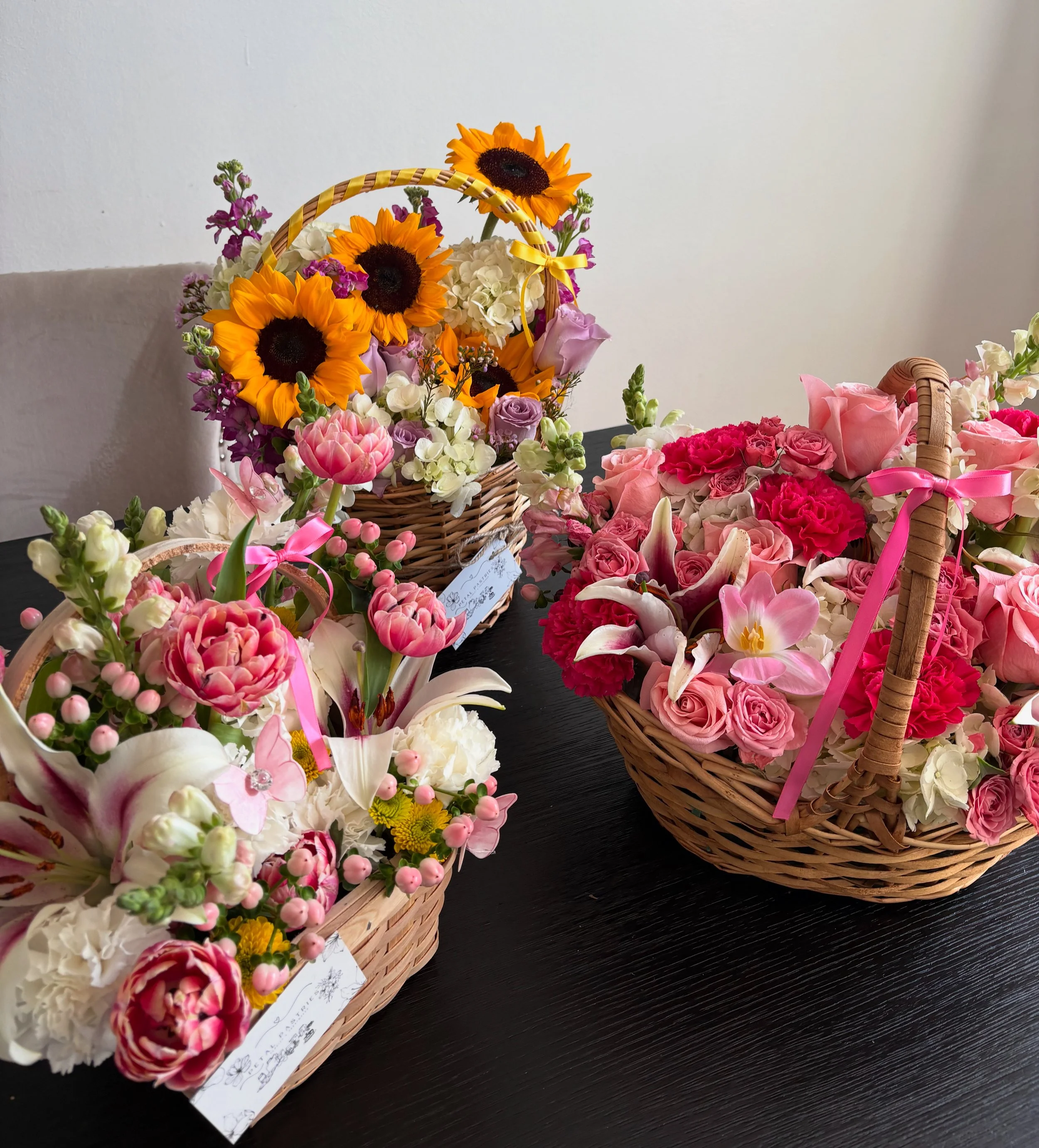 Our Mixed Bloom Baskets are made with seasonal mixed flowers in a variety of colors. Each basket is designed to be bright, fresh, and perfect for any occasion.